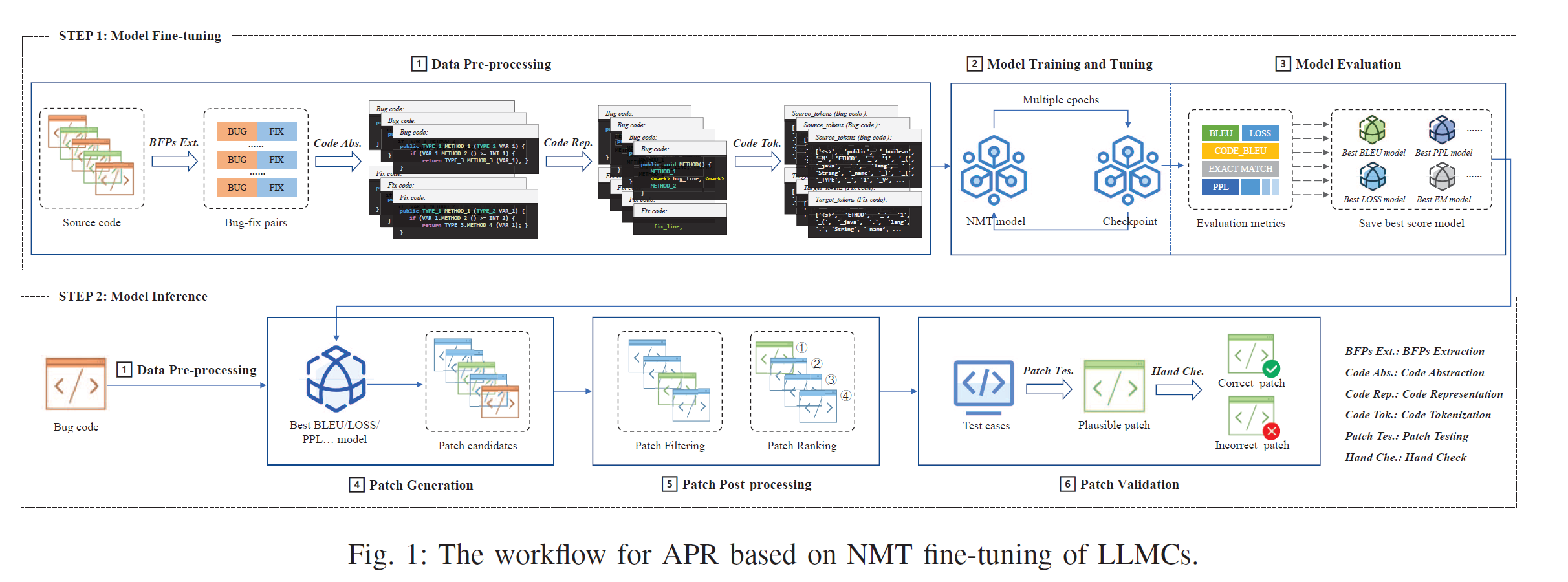 其中1-3步为模型微调任务,也是该研究的主要内容,4-6为模型应用。该研究主要聚焦于APR的上游任务,即数据预处理及模型训练。