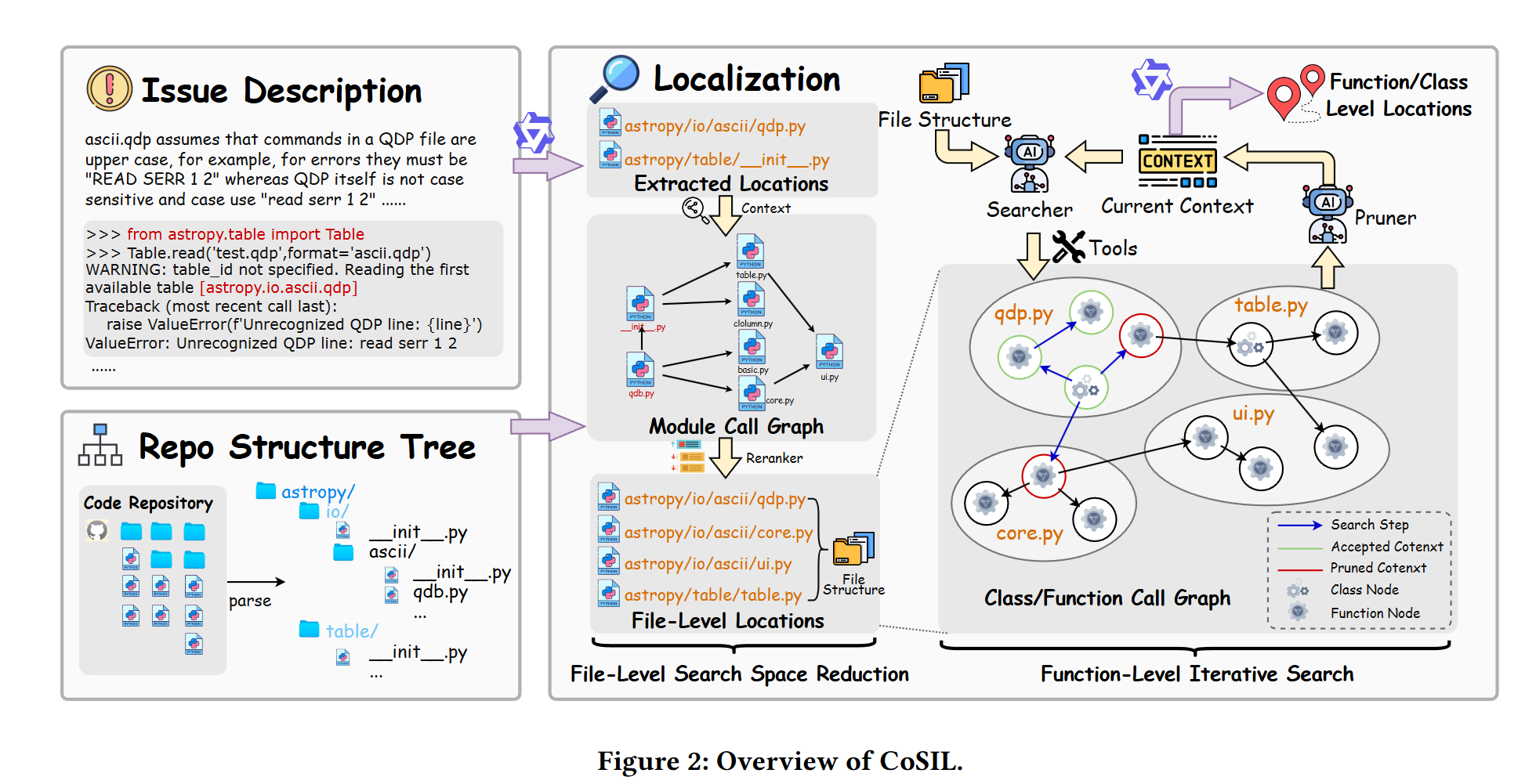 相当于一个分级搜索,首先针对issue描述,基于Module Call Graph搜索搜索相关代码文件,然后针对相关代码文件,构建Function Call Graph,搜索相关函数。